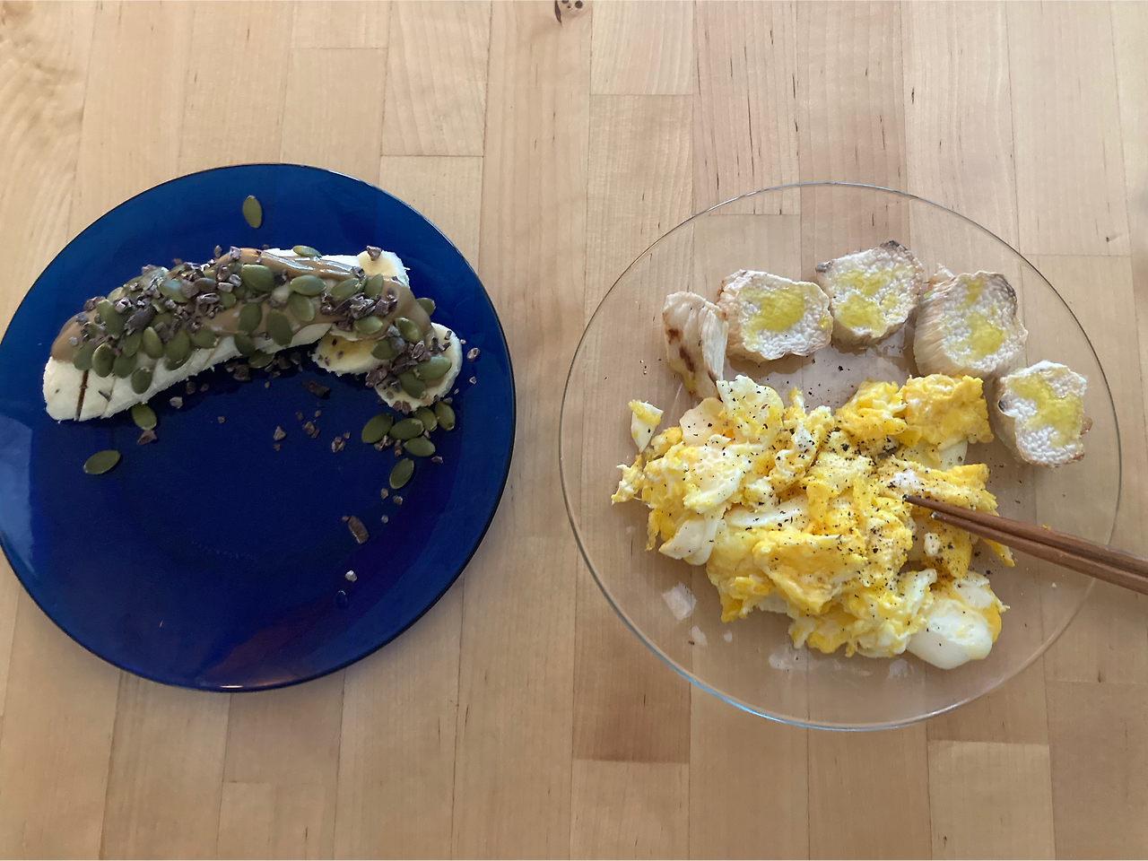 내 아침 : 바나나+해바라기씨버터+호박씨+카카오닙스 (어제 이렇게 먹었는데 꽤나 맛있었다) / 스크램블에그, 마 구운것에 올리브오일 뿌린것