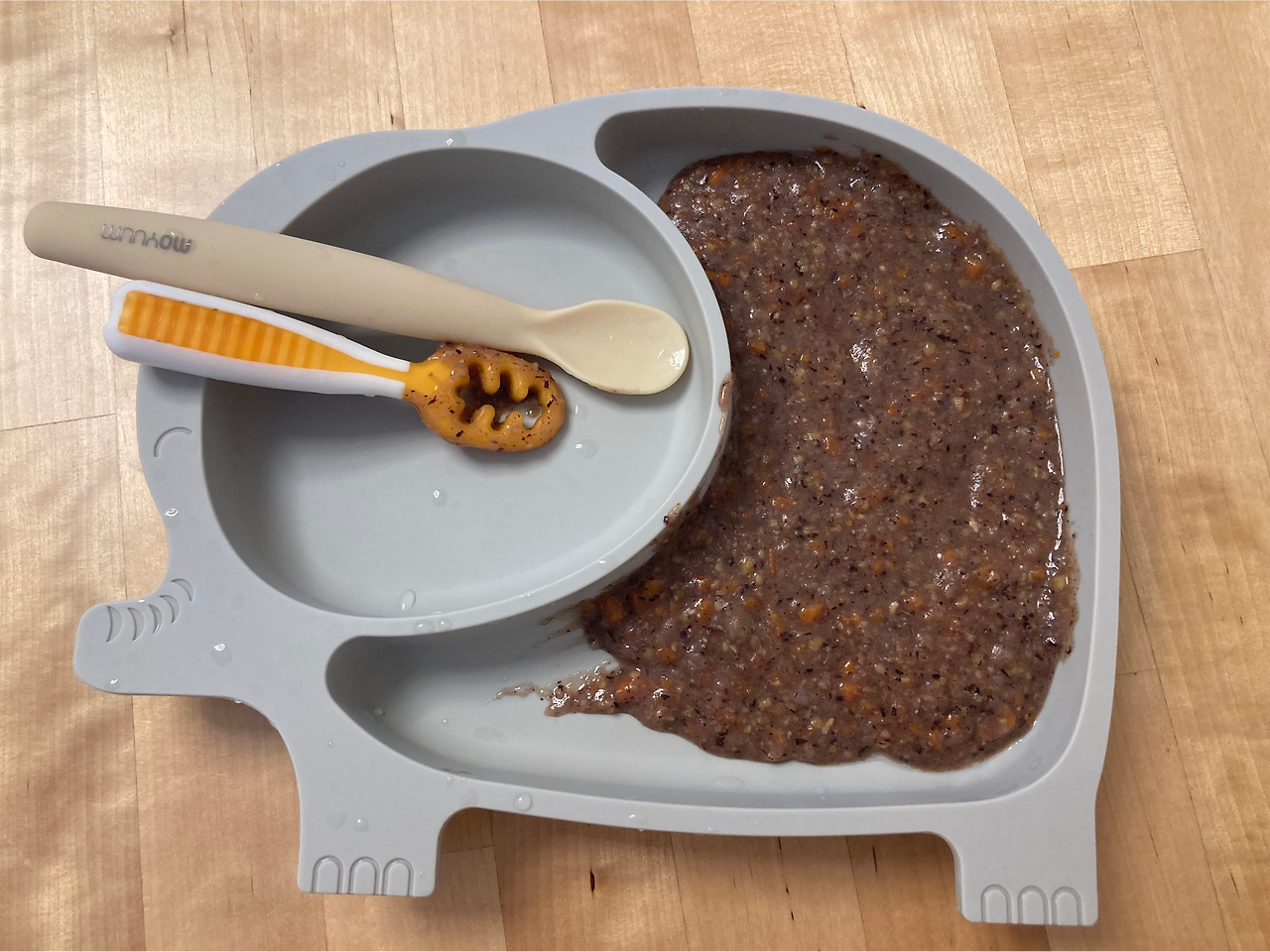 점심이 조금 부족했는지 찡찡대서 간식을 먹였다. 잘 익은 바나나라 너무 단 것 같아서 바나나만 먹이기는 좀 그러니 치아씨드를 섞고 해바라기씨 버터도 같이 넣어서 과즙망에 넣어줬다.