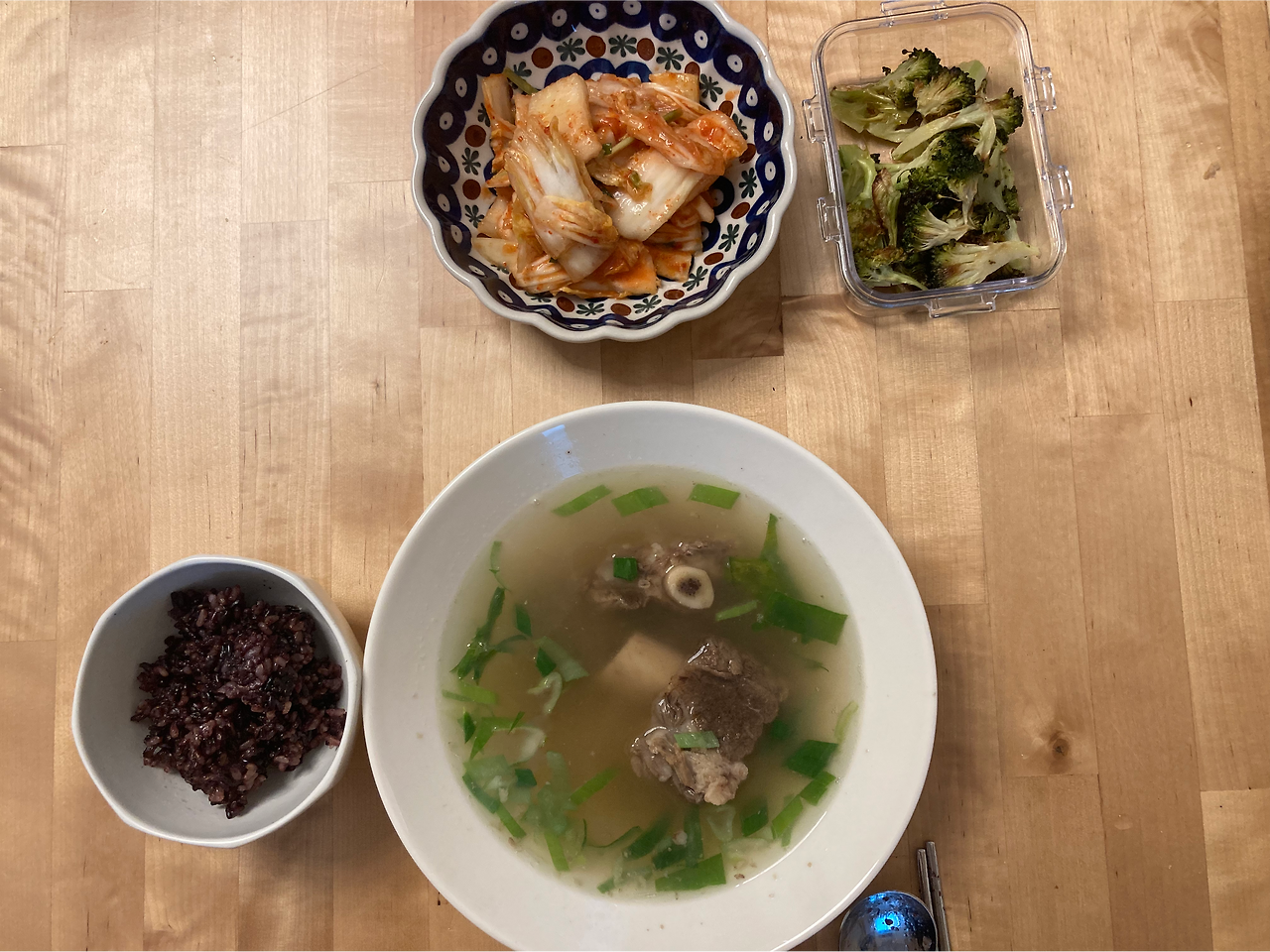 그래서 해동해두었던 갈비탕 간편식과 냉장고에 있던 흑미현미밥, 브로콜리 구운것, 엄마표 배추김치를 먹었다.