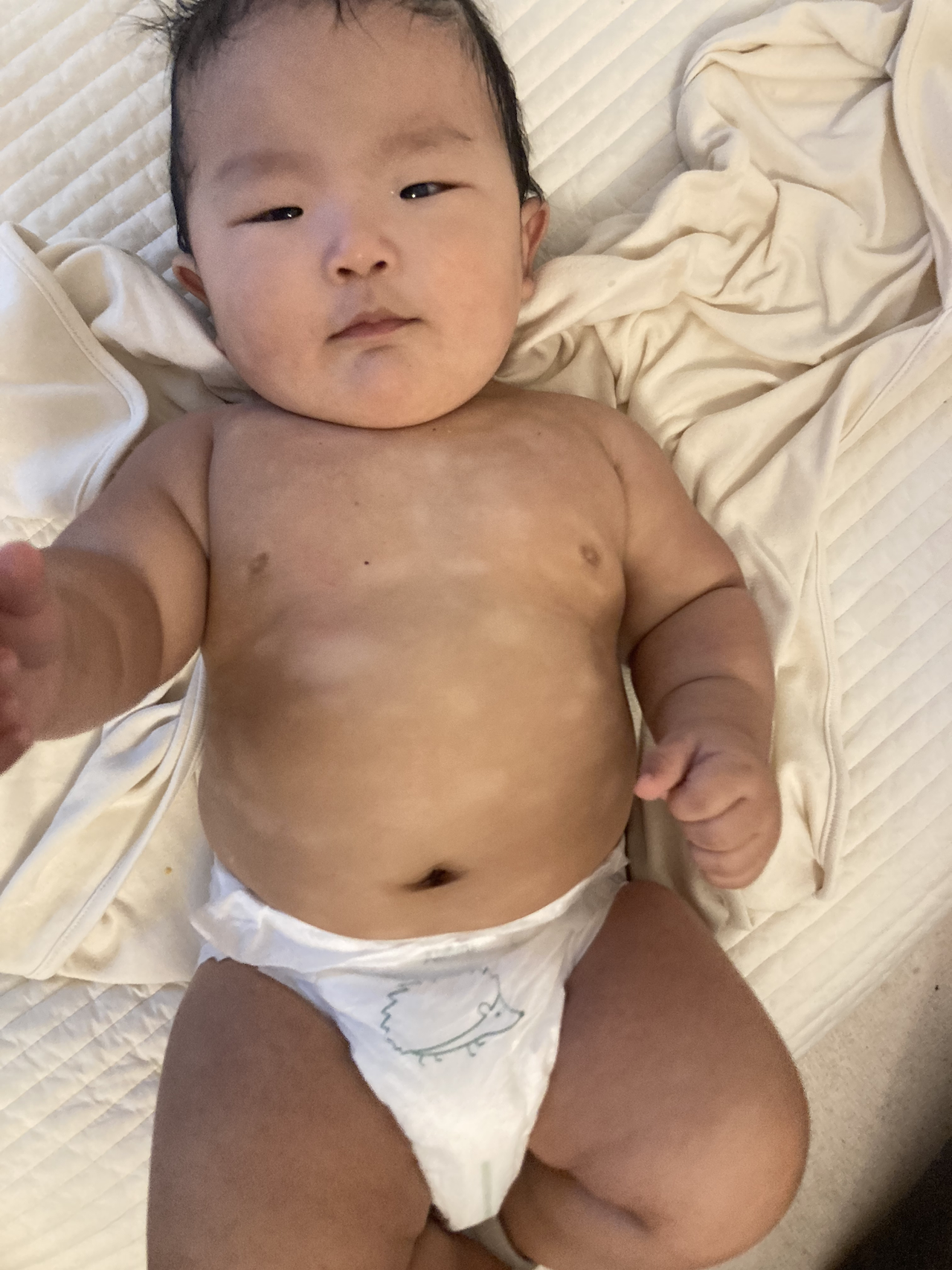 오늘 저녁에 찍은 태오 사진인데 오늘 약간 붉은 부분이 남아있는 것 같지만 전반적으로 좋다. 흰 얼룩? 같은 부분은 아토피가 생겨서 각질이 벗겨진 후 새살이 돋아서 색이 다른거다. 색이 같아지려면 시간이 걸리겠지만 일단 아토피가 아주 많이 호전됐다.