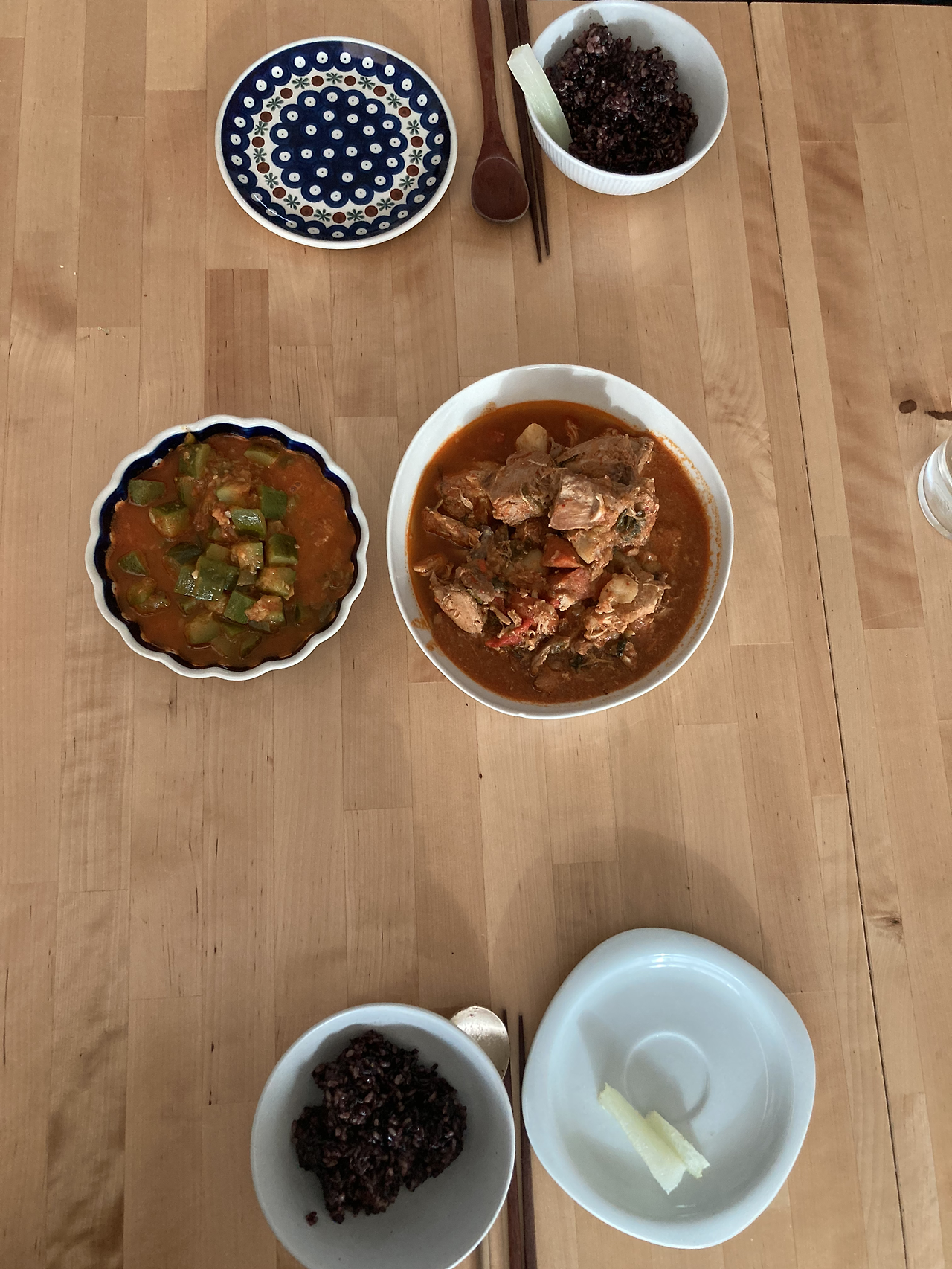 내 저녁 : 흑미밥, 닭도리탕, 호박찌개, 무 찐것 (태오 주고 남은것)
