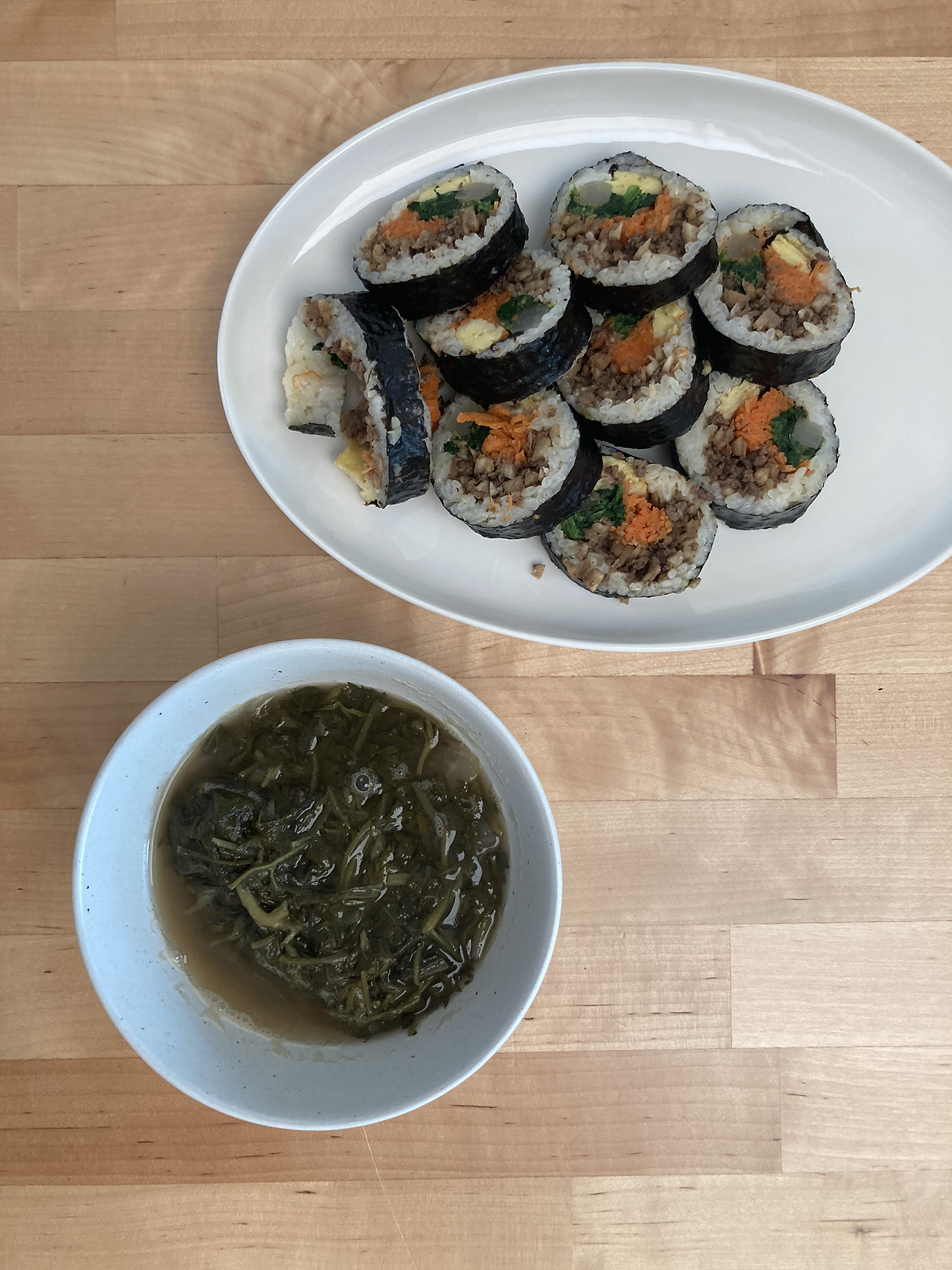 요즘 피로가 쌓여서 주말에도 길게 요리하지 못해서 엄마 음식에 의존도가 높아졌다. 밥이 좀 질려가려고 했는데 엄마가 마침 김밥을 말아서 오셨다. 소풍갈때 싸주셨던 김밥맛이 떠올라서 더 좋았고, 사먹는 김밥에서 나는 조미료의 쨍한 맛이 없어서 너무 좋았다. 집밥을 먹으면 먹을수록 밖에서 사먹는 조리료 맛에 예민해지게 된다.