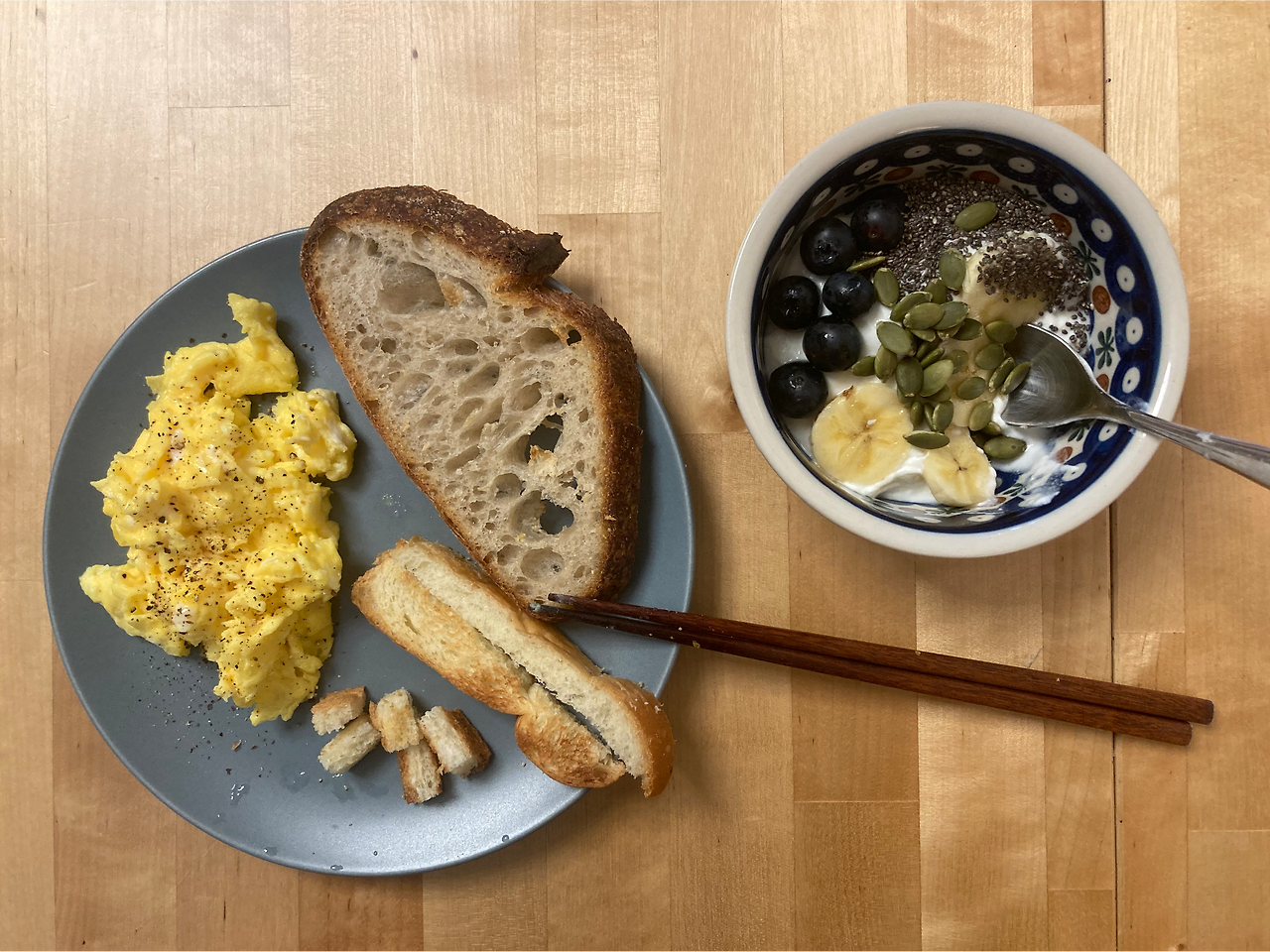 내 아침 : 스크램블 에그, 사워도우 빵 (타르틴 제품), 태오 주고 남은 자투리 식빵, 요거트, 블루베리, 바나나, 치아씨드, 호박씨