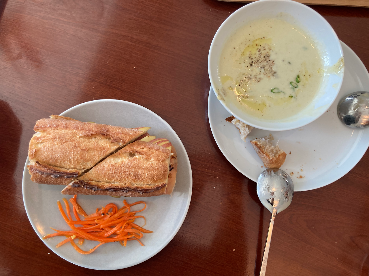 내 점심 : 샌드위치(바게트, 사과, 프로슈토햄), 당근라페 샐러드, 감자스프, 레몬주스
