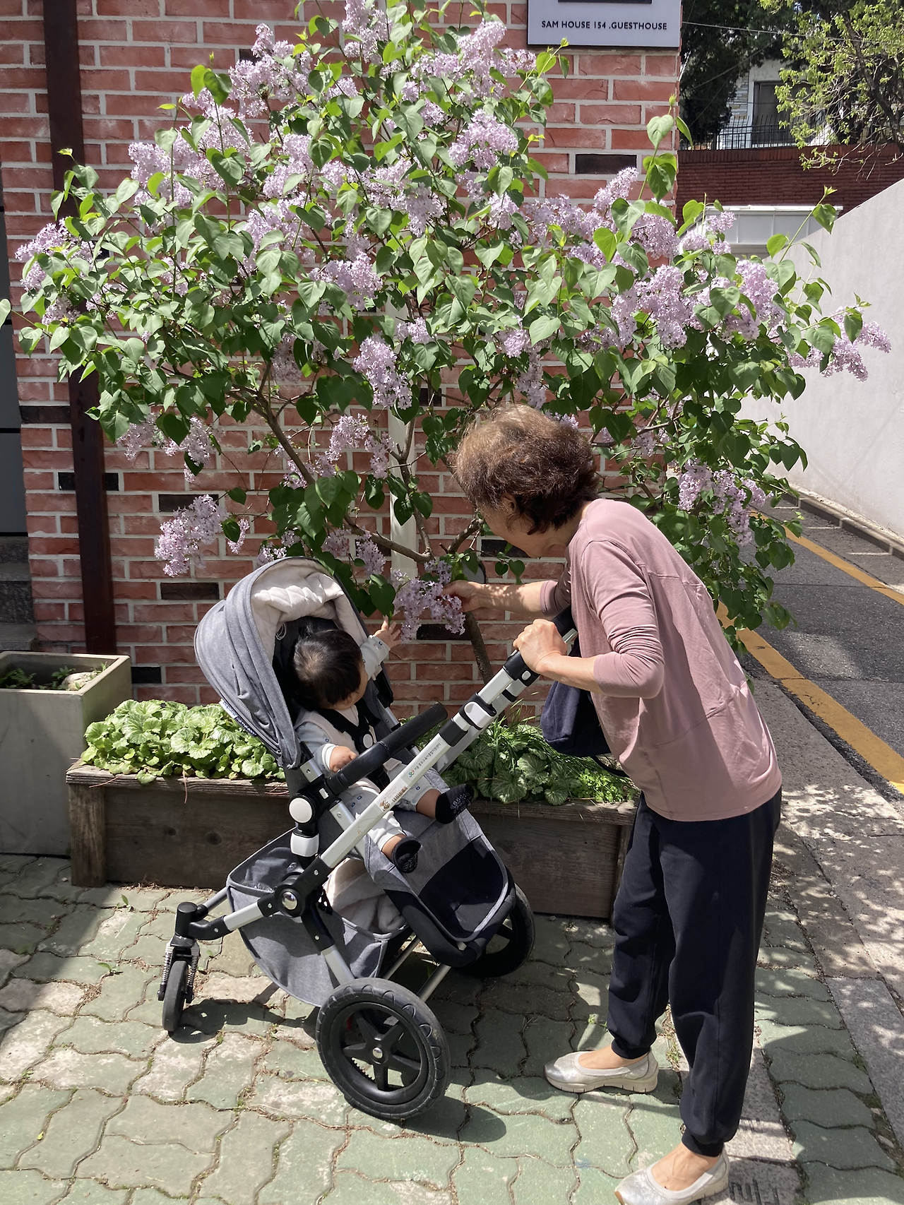 오늘 점심 먹으러 가는 길에 엄마랑 태오가 봄볕 아래 라일락 향기를 맡고 있는 사진 ㅎㅎ