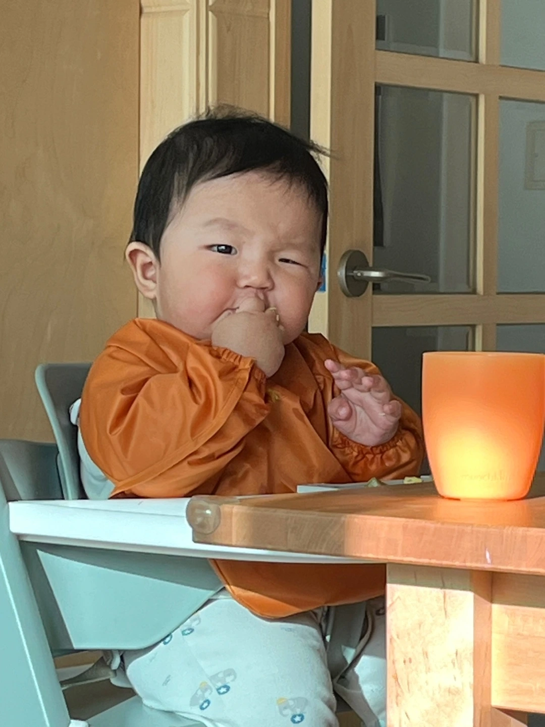 아침 먹기 전 내가 산책하는 동안 태오는 남편이 집에서 이유식을 먹였다.