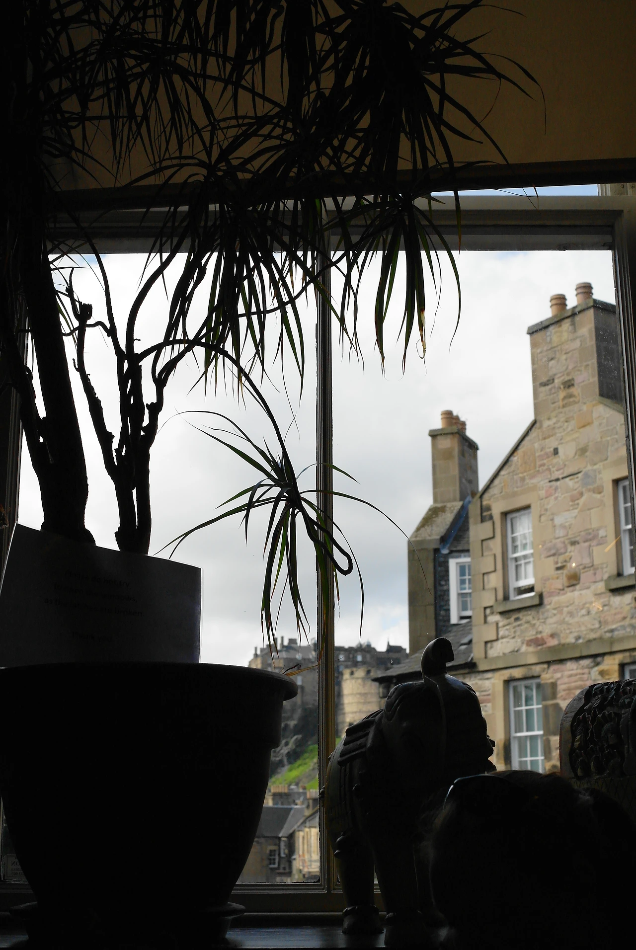 ⓒ클로이의 순간포착 - 기다림 끝에 들어선 카페 내부, 창 밖 저 멀리 어렴풋이 보이는 에든버러의 성곽 어깨 크트 머리