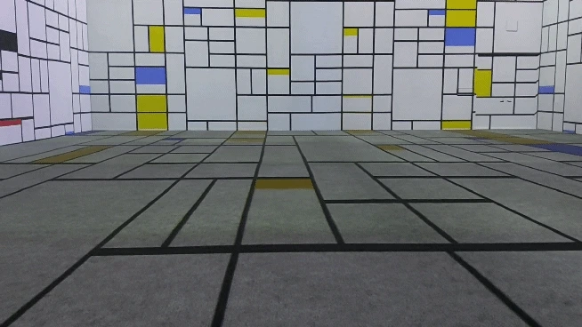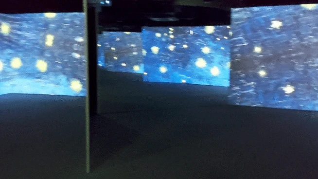 커다란 무대와 같은 곳에 벽면에서 바닥으로 양옆 좌우 270도로 예술작품이 쏟아진다.