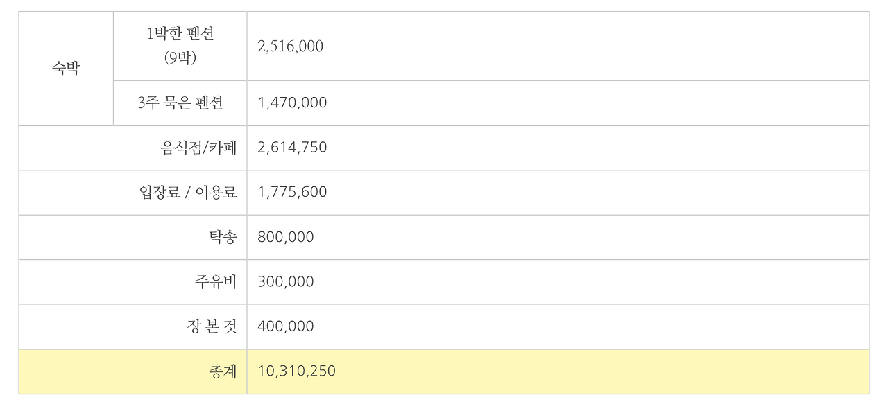 총비용 약 1천만원. 4인가족이 31일간 사용했다고 생각하면 괜찮은것같기도, 과하게 쓴 것 같은 느낌도 있다. 그런데 정말 한끼 외식하면 기본적으로 10만원 정도 잡아야했고, 액티비티를 하나 하려해도 기본적으로 10만원 정도라 금액이 많이 나온건 별수가 없다.