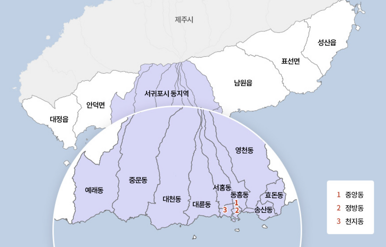 서귀포시에는 중앙동, 정방동, 천지동, 예래동, 중문동, 대천동, 대륜동, 서홍동, 동흥동, 영천동, 효돈동, 송산동이 포함되어있다.