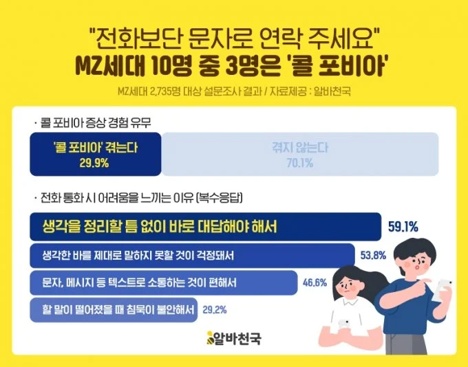알바천국이 MZ세대 2735명을 대상으로 조사한 설문에서 30%가까이 '콜 포비아'를 겪는다고 답했다.