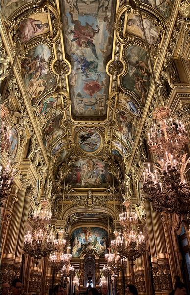 안으로 발을 들이자마자 마주한 공간은 어떤 말로도 표현하기 힘들 만큼 황홀했다. 형용할 수 없는 고풍스러운 기품과 우아함이 어우러진 공간은 숨이 막힐 정도로 아름다웠다. 빛나는 황금빛 대리석 계단과 머리 위에서 반짝이는 샹들리에를 보고 있자니 파리의 모든 아름다움을 한데 응축해 놓은 듯 찬란하게 빛나고 있었다. 샤갈의 천장화를 보기 위해 설레는 마음으로 오페라 가르니에를 찾았지만, '가는 날이 장날'이라고 오늘따라 대공연장은 출입이 통제되어 샤갈의 천장화는 볼 수 없었다. 기대가 컸던 만큼 아쉬움도 컸지만, 눈앞에 펼쳐진 눈부신 황금빛 대리석 계단과 샹들리에만으로도 충분히 위로가 되는 시간이었다.