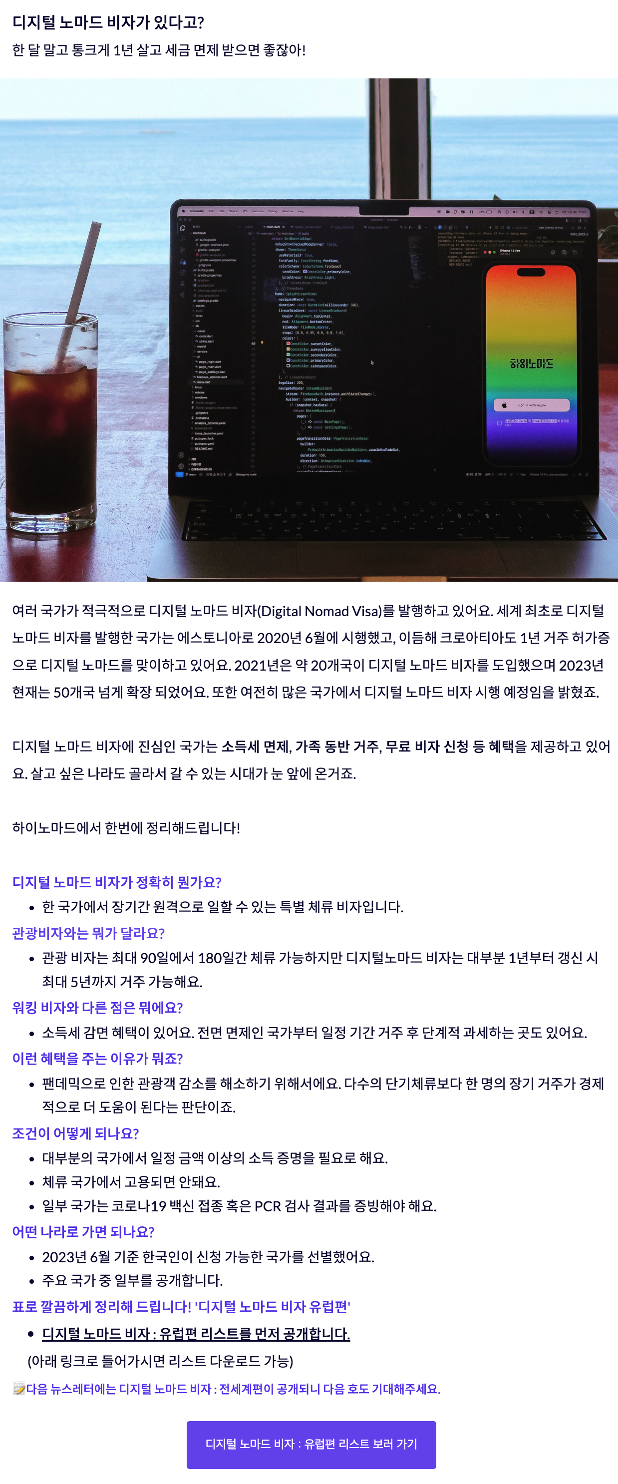 디지털 노마드 커뮤니티 하이노마드에서 발행하는 뉴스레터에 굉장히 좋은 정보들이 많은데, 그중에 세계 여러 나라의 디지털 노마드 비자 현황을 조사해 놓은 것이 있다. 프리워커들을 위한 소식을 듣고 싶다면 2주에 한 번씩 발행되는 뉴스레터를 수신해 보길 바란다.