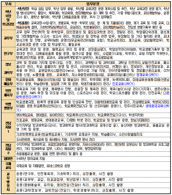 그러나 현실은 내 예상을 보기 좋게 비껴나갔다. 학교에는 담임 업무 외에도 수 십, 아니 족히 백 가지가 넘는 '업무'라는 것이 버젓이 존재하고 있었다. 업무분장표를 쳐다보고 있자니, 6 학급 밖에 안 되는 이 작은 학교에 무슨 업무가 이리도 많은지 도무지 이해하기 힘들었다.