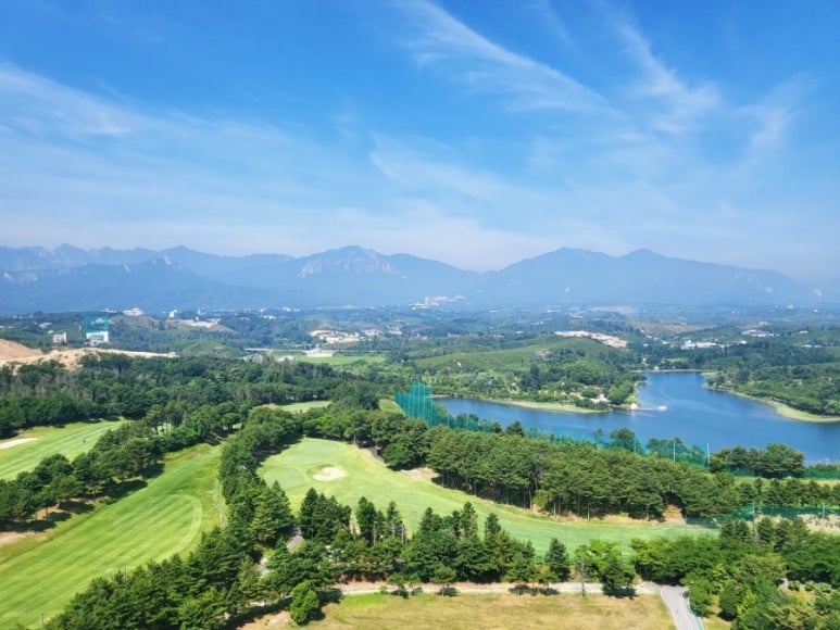 벽 전체가 유리로 되어있어 멀리 있는 호수와 산이 잘 보였다. 마침 쾌청한 날씨에 산의 절벽과 나무 하나까지도 나의 눈에 선명하게 비쳤다.