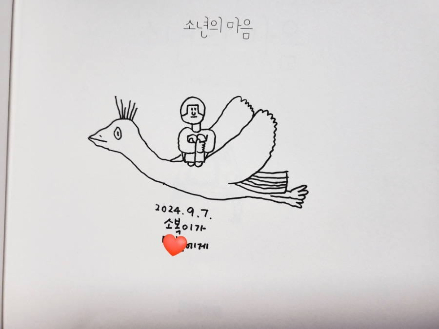 두 시간의 강연이 끝나고 선물로 나누어 준 책에 직접 사인을 해주는 시간을 가졌다. 작가님의 사인은 독특하게도 휘리릭 쓰는 사인이 아닌 그림을 그려주는 것이라고 했다. 책 마다마다에 나오는 주인공을 앞장, 혹은 뒷장에 마음을 담아 그리며 아이와 짧게나마 대화도 한다고.