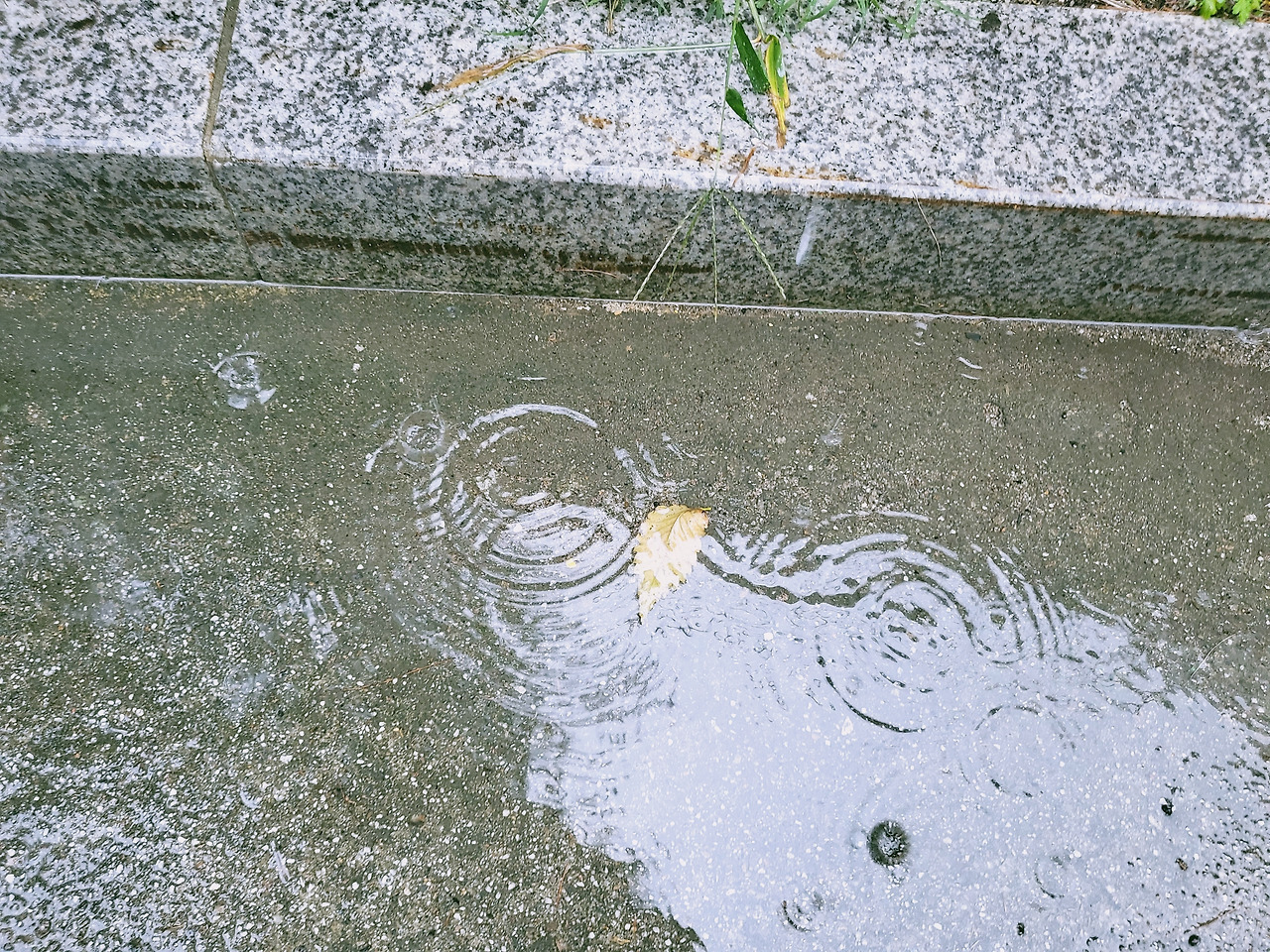 낙엽이 지고 빗물에 잠겼다.