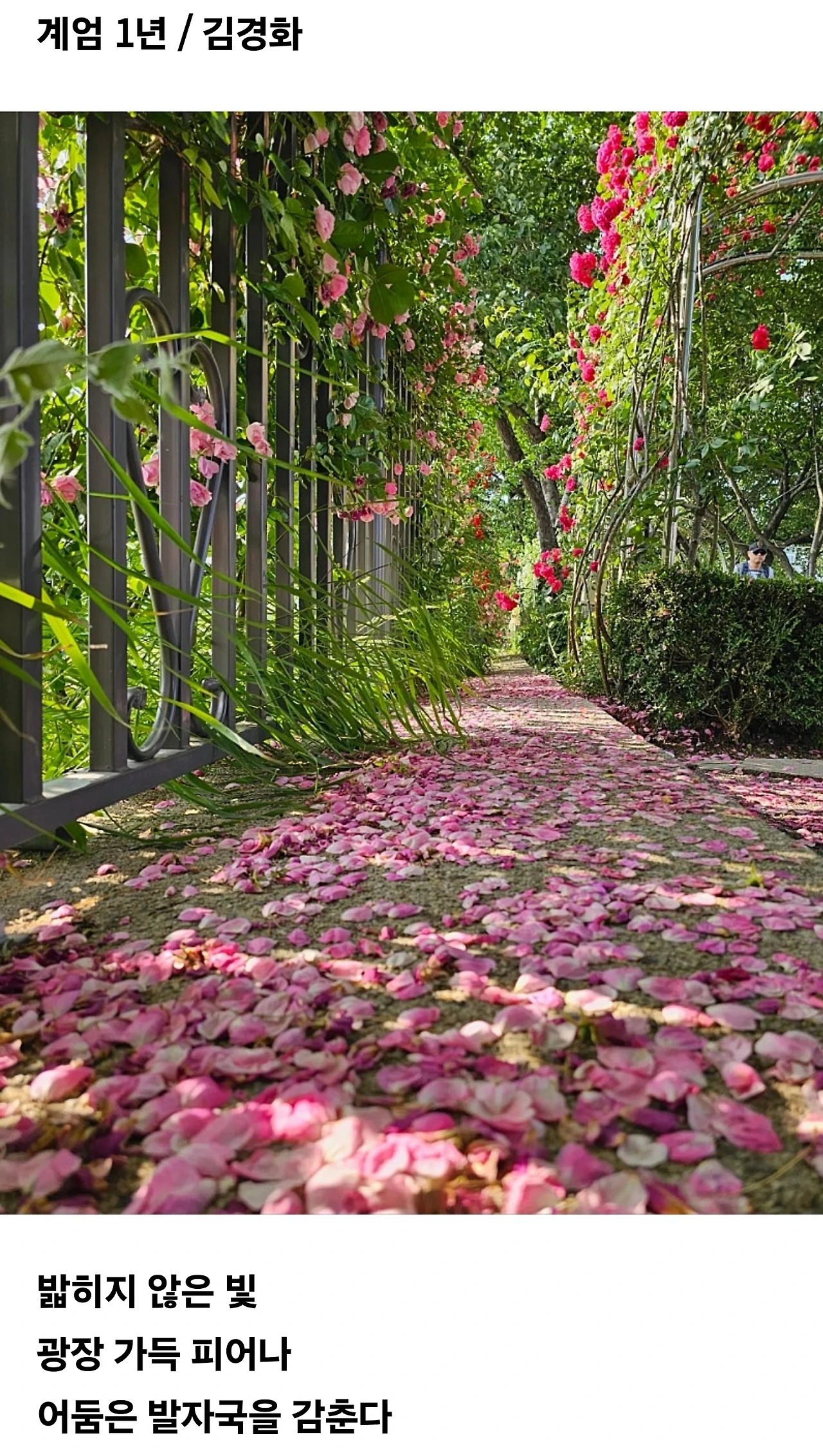 길 위에 흩뿌려진 꽃잎들을 보며 지난겨울의 광장을 떠올린다.누군가는 밟고 지나갈 낙화(落花)라부를지 모르나,내 눈에는 쇠창살을 넘어선 자유의 파편들로 보였다.어둠이 슬그머니 발자국을 감추는 시간.빛은 바닥에서부터 다시 피어난다.지워지지 않는 기억처럼, 선명하게.#계엄#디카시#김경화디카시#빛#광장