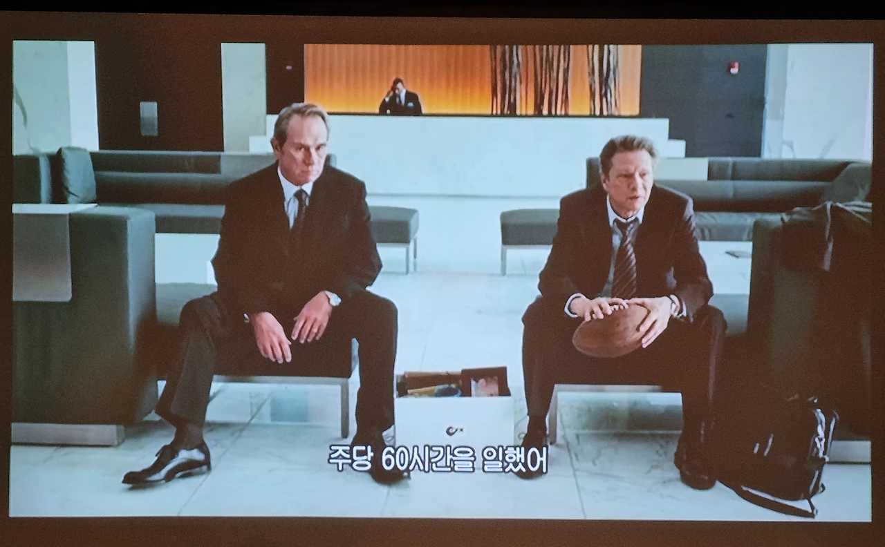 오늘 본 영화는 <더 컴퍼니 맨>. 해당 장면은 대기업 GTX의 계열사 사장 진과 임원 필이 그룹 회장 지시로 해고를 통보받은 뒤 나누는 대화다.