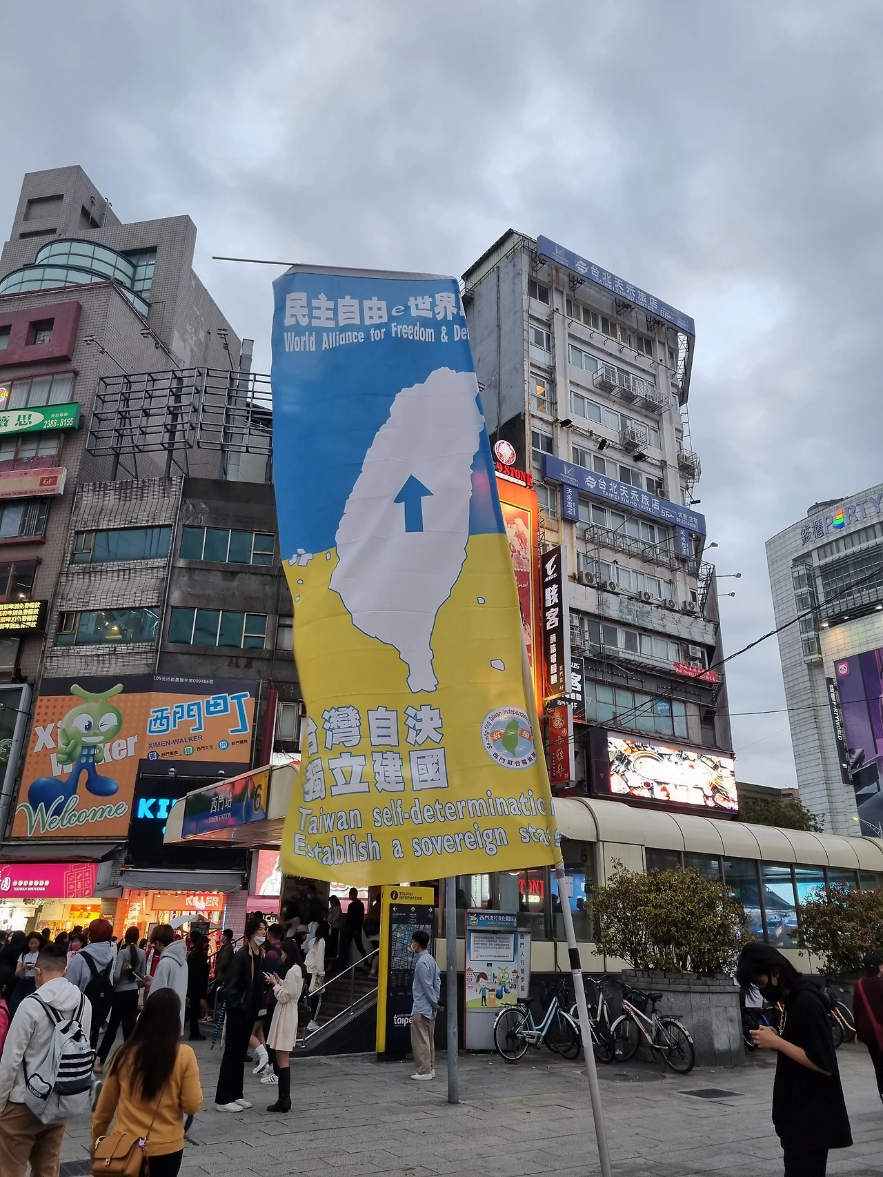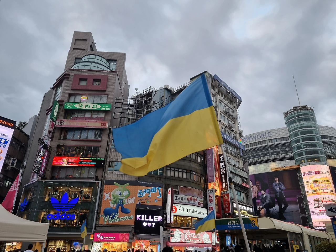 대만 여행 첫날, 타이베이 시먼딩에서 우크라이나 국기를 봤다. 하늘색이 위, 노란색이 아래를 채운 이색기. 생뚱맞다고 생각하며 다가가 보니 세로로 긴 깃발도 하나 걸려 있었다. 우크라이나 국기 안에 타이완 지도가 흰색으로 그려진 깃발이었다. 깃발의 위, 아래는 한자와 영어가 채웠다 "민주자유 세계연합", "대만자결 독립건국".