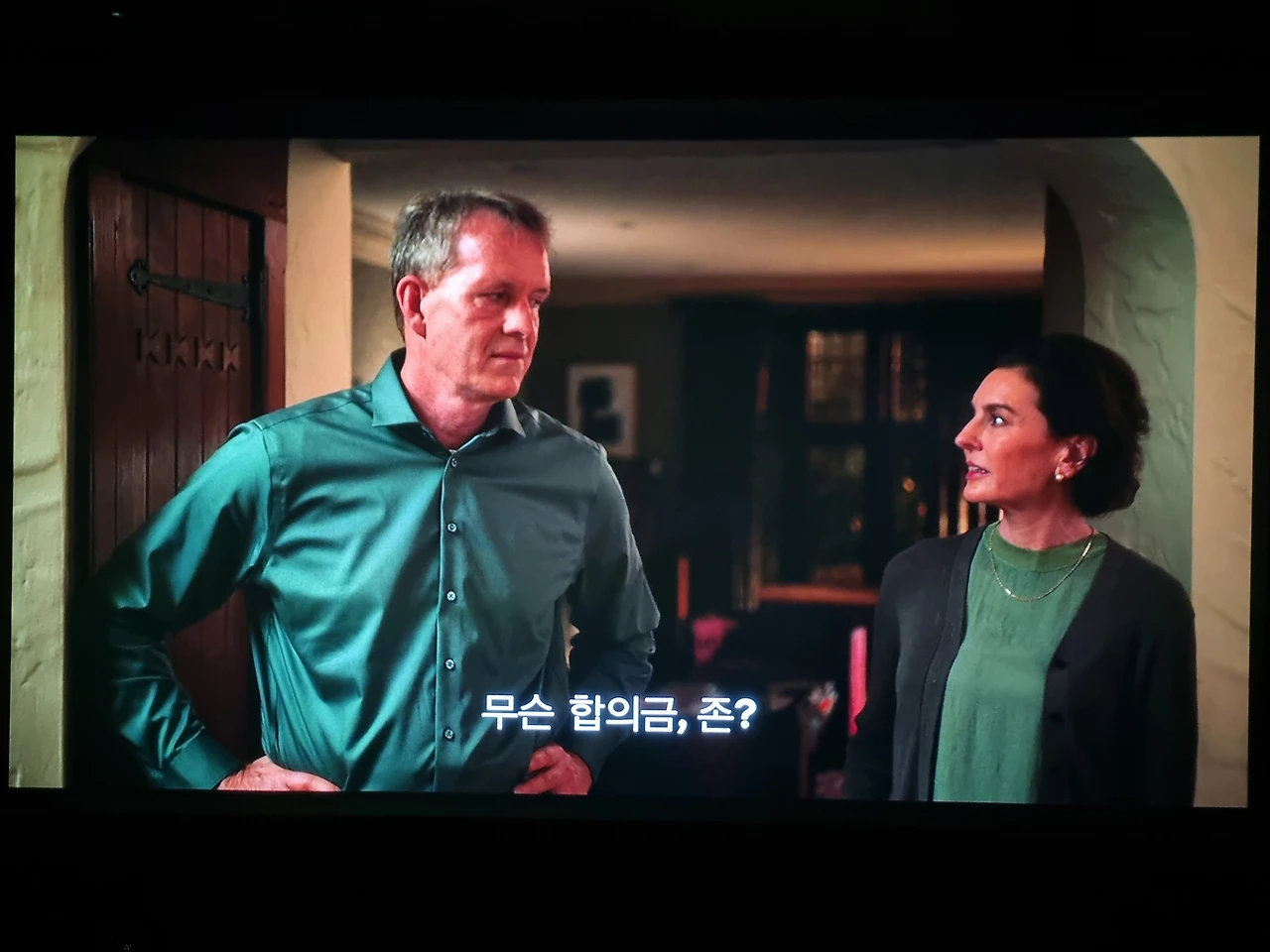 메건은 전 재무팀장에게 묻는다. "합의한 여성은 입을 열지 못해요. 그랬다간 소송당하니까요. 그런 제약이 없는 누군가가 합의금에 관해 말해준다면 큰 도움이 될 겁니다." 사진은 메건의 대사 직후 등장하는 장면이다. "무슨 합의금, 존?" 이후 "생각 좀 해볼게요"라는 전 재무팀장의 답변에 이르기까지 10초 남짓 짧은 쇼트는 불편한 침묵, 그리고 불안과 의심이 담긴 아내의 시선을 담아낸다.