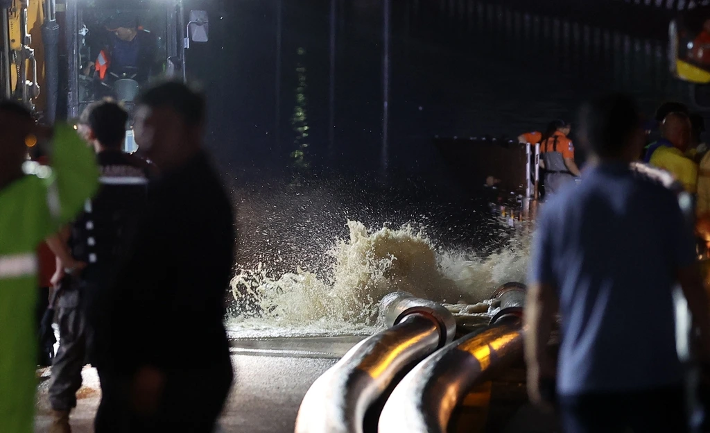 지난달 15일 충북 청주시 오송읍 궁평2지하차도가 침수돼 소방당국이 실종자 구조를 위한 양수 작업을 하고 있다. 경향신문 사진(조태형 기자)