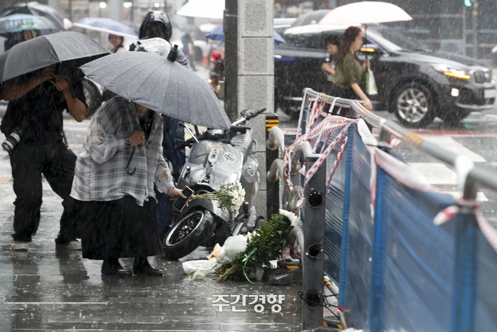역주행 차량이 인도를 덮쳐 9명이 숨지고 4명이 다치는 사고가 발생한 서울 시청역 인근 안전 펜스가 부서진 자리에 지난 2일 한 시민이 국화꽃을 놓고 있다. 경향신문 문재원 기자