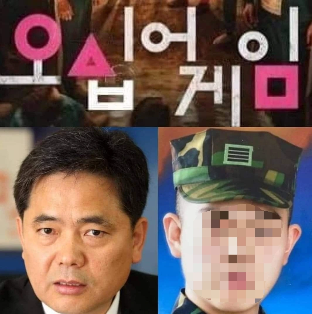 네티즌들이 공유한 넷플릭스 드라마 <오징어 게임>의 패러디. 최근 국민의힘을 탈당한 곽상도 의원과 그의 아들 곽병채씨(하단 오른쪽) 사진을 '오십억 게임'이라는 글자와 합성했다.