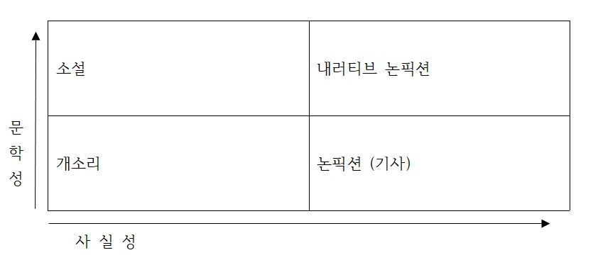 소설, 논픽션, 내러티브 논픽션의 위치를 그린 사분면. 학술적 근거가 딱히 있지는 않다. 야매다.