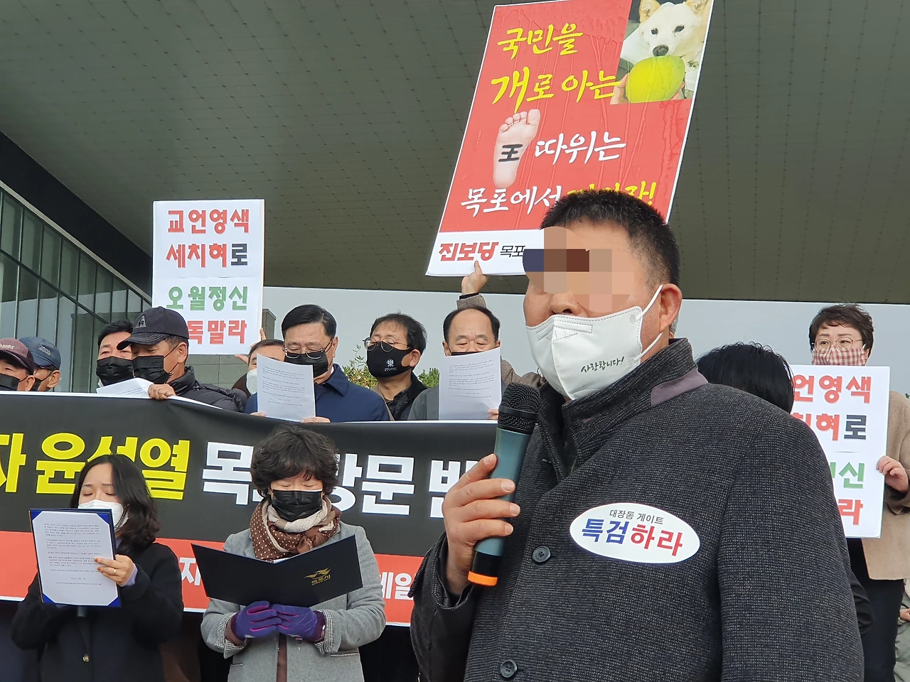 11일 오전 전남 목포 김대중 노벨평화상기념관 앞. 이정석 전 전남5·18민중항쟁기념행사위원회 집행위원장의 목소리가 떨렸다. 그는 윤석열 국민의힘 대선 후보의 방문을 앞두고 이곳에 왔다. 목포지역 시민사회단체 관계자 20여명과 ‘민주헌정질서 파괴자 윤석열 목포방문 반대한다’ 플래카드를 내걸고 기자회견을 열었다. 윤 후보가 경선 과정에서 꺼낸 ‘전두환 옹호’ 발언과 ‘개 사과’ 사진 게시에 항의하기 위해서였다. 기념관 계단 위에서 그는 “제대로 된 사과 없이 광주와 목포에 방문하는 건 지역 지지율 회복을 노린 정치쇼에 불과하다”고 말했다.