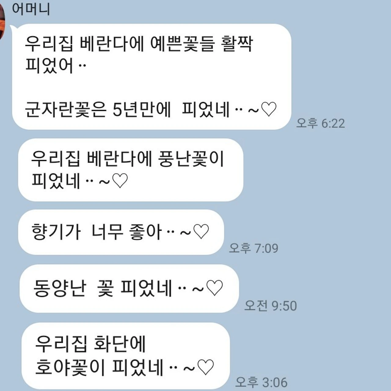 꽤 오랜 시간 가족 단체채팅방에서 어머니의 메시지를 적당히 무시했다. “아들, 베란다에 풍란꽃이 예쁘게 폈다.” “여보, 꽃이 활짝 폈어요.” 어떤 때는 “예쁘네”라고 답했지만 때로는 답장하지 않았다. 메시지와 함께 전송된 파일을 눌러본 적도 별로 없다. 그저 ‘또 꽃 사진이구나’ 생각할 뿐이었다. 어차피 무슨 꽃인지도 잘 모르니까.