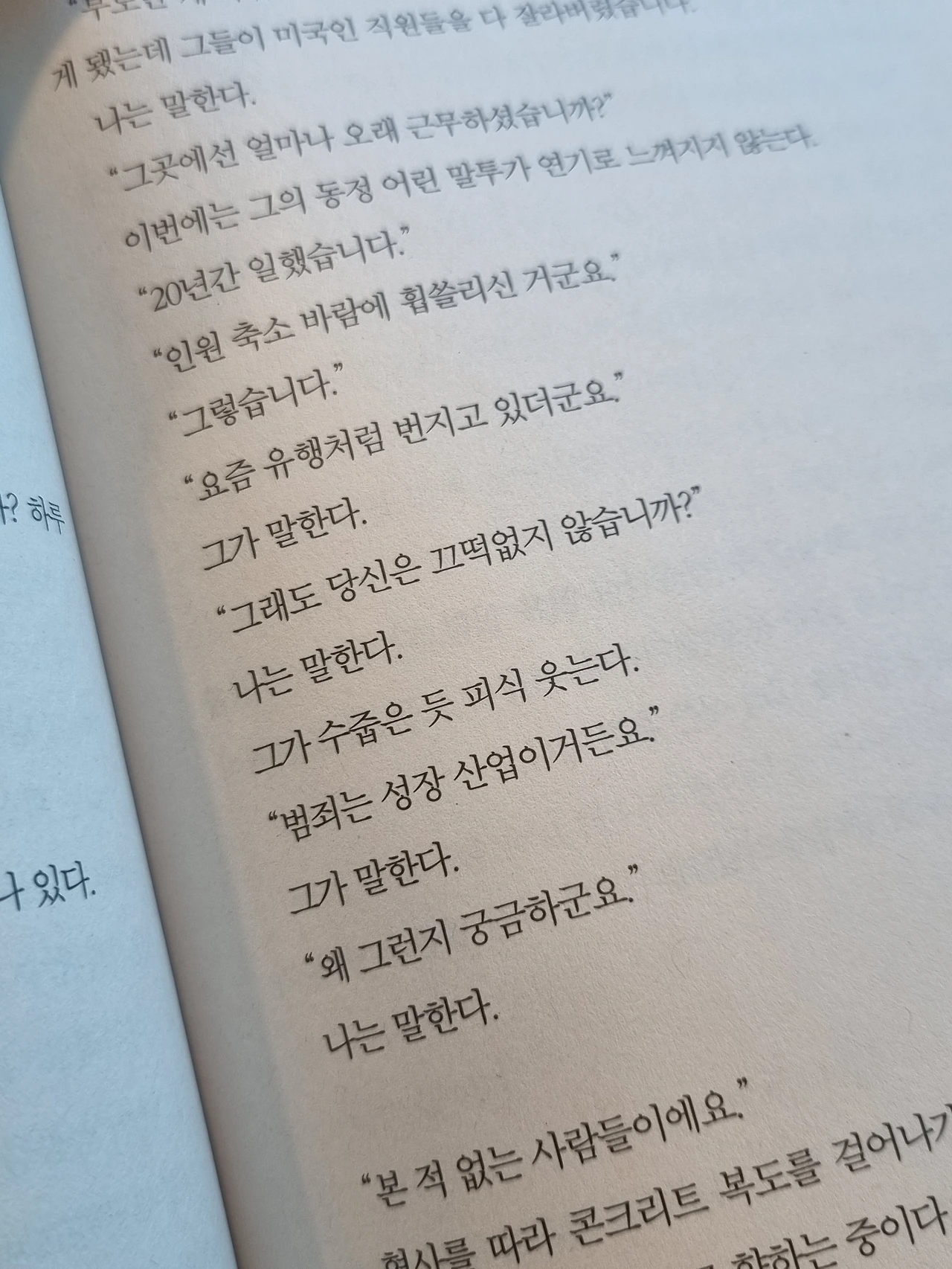 그들과 인간적으로 가까워지면 안돼. 이 일을 시작했을 때부터 세워뒀던 방침이었다. 아니, 그보다 훨씬 전부터 다짐해온 내용이었다. 그들과 인간적으로 가까워지면 내가 해야할 일을 제대로 처리할 수 없기 때문이다. - 97p