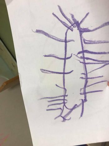 그런데, 아이가 의미 없는 줄 긋기만 해대다가 태어나서 처음으로 뭔가 물체? 존재? 같은 것을 그리기 시작했다.