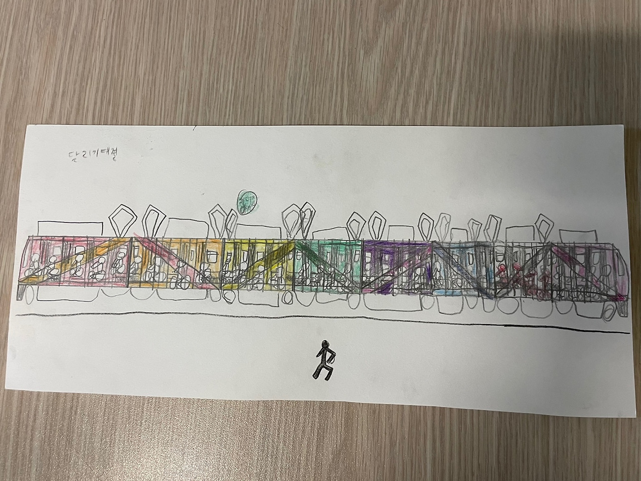 바로 이 그림이다. 처음에는 무지개 기차, 무지개 기차... 하고 계속 반복하더니 대결, 대결, 사람하고 대결... 하고 중얼거리며 이 그림을 완성해냈다.