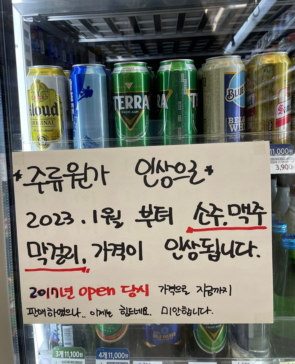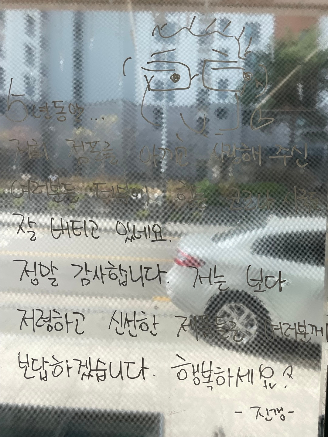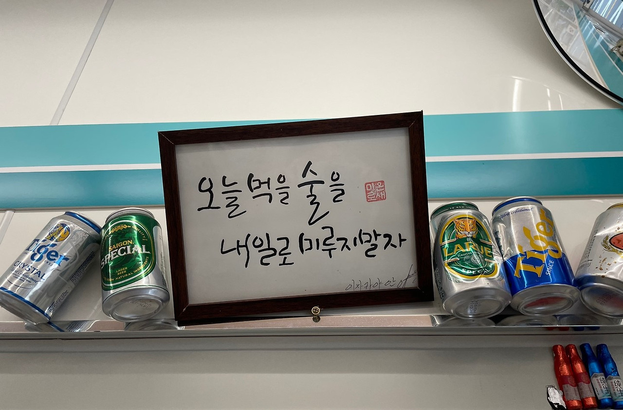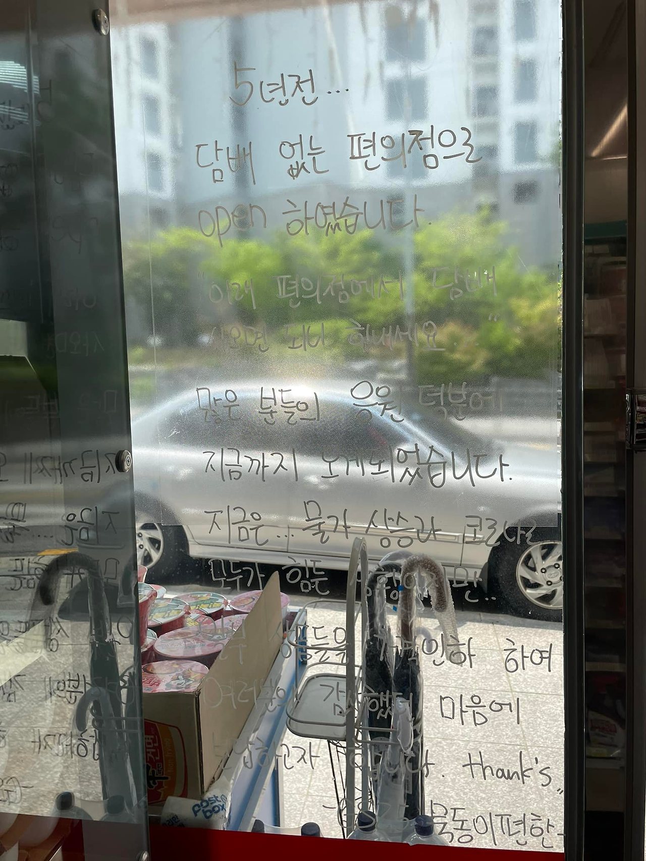 - 지난 봄이었나요, 코로나 시기에 장문의 편지를 편의점 유리문에 써놓으셨던 것이 기억납니다. 그걸 보고 여기 사장님은 소싯적에 ‘문청(문학청년)’이셨나 싶었어요.