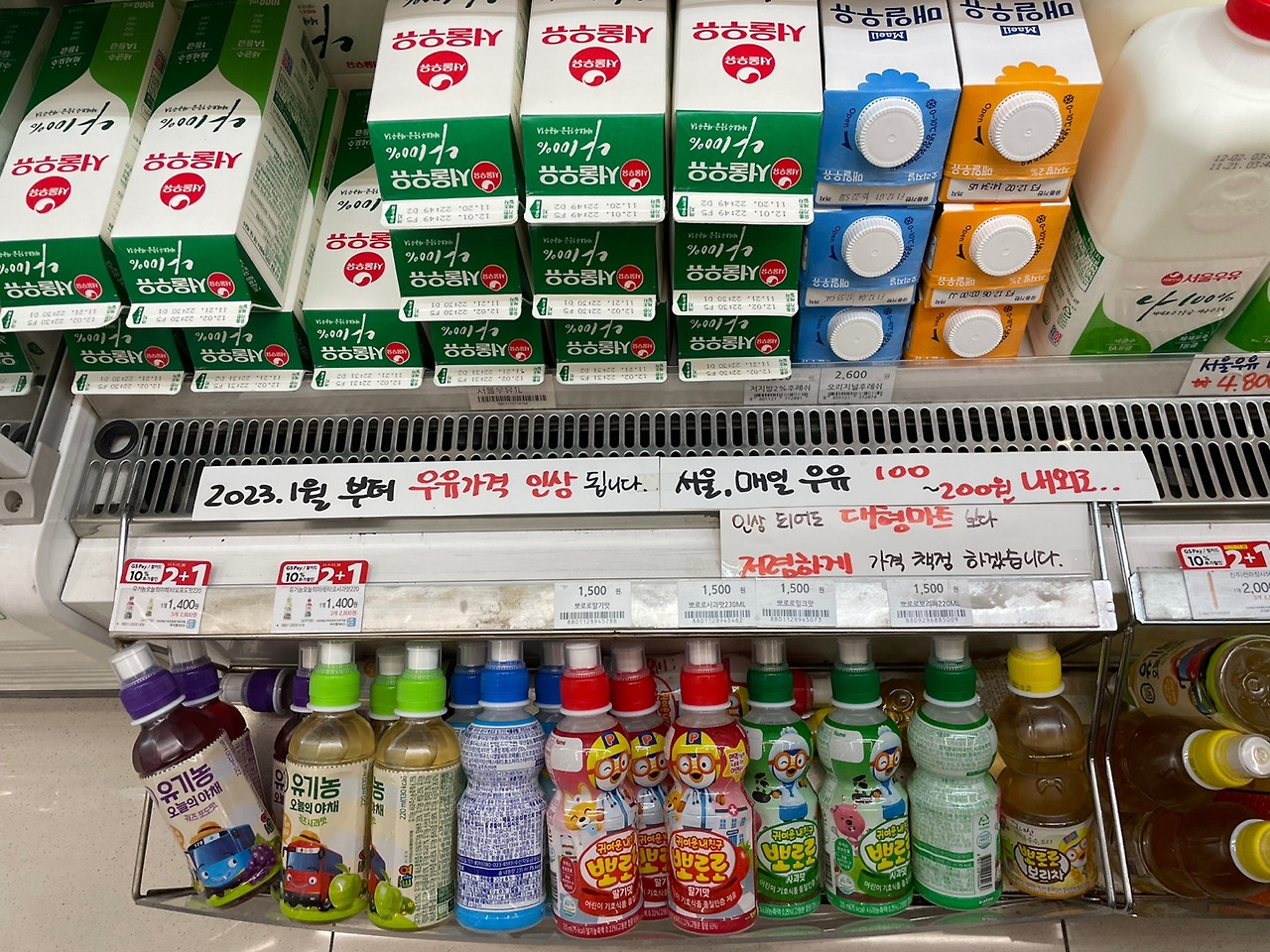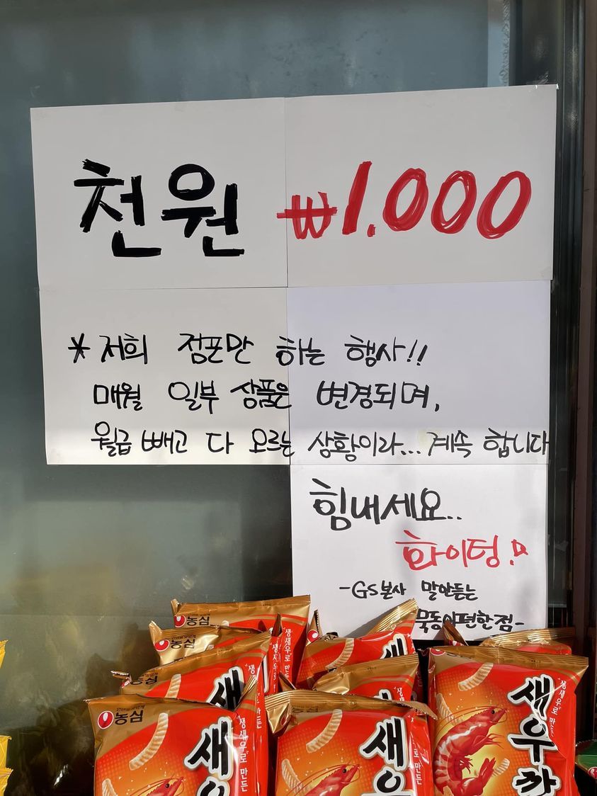 그러다가 마침내 편의점 앞에 ‘천 원’ 매대를 보게 되었다. 월급 빼고 다 오른 지금, 모든 물건이 너무 비싸서 이 매대에 있는 모든 물건 1000원에 판매한다는 것. 그리고 사장님의 센스있는 마지막. ‘GS 본사 말 안 듣는’ GS 이 편한 점 올림.