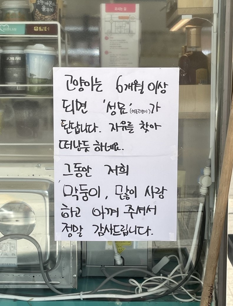 편의점 고양이는 이 동네 초, 중, 고 학생들에게 인기 짱이었다! 여자친구들은 막둥이네 집이 된 박스에서 발길을 못 떼고 쭈그리고 앉아 조심스럽게 안을 들여다보고 있었고, 막 변성기를 맞은 남자아이들도 와! 고양이! 와! 하면서 신나게 쇳소리를 냈다. 가끔은 지나가면서 저렇게 사람 손 타서 어디 아프기라도 하면 어쩌나 싶기도 할 정도였다. 그만큼 동네 아이들의 고양이 사랑은 최고였다. 그러던 어느 날, 편의점 문 앞에 막둥이는 성묘가 되어 자유를 찾아 떠난다는 마지막 소식이 전해졌다.