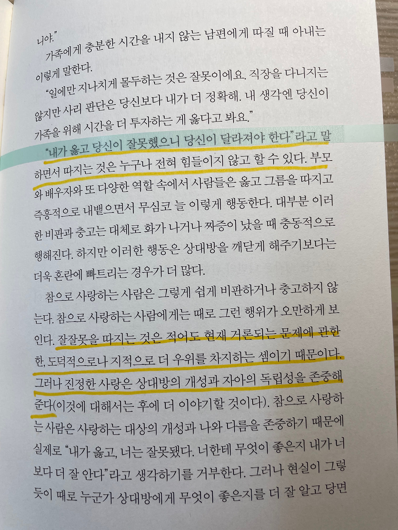 잘잘못을 따지는 것은 적어도 현대 거론되는 문제에 관한 한, 도덕적으로나 지적으로 더 우위를 차지하는 셈이기 때문이다. 그러나 진정한 사랑은 상대방의 개성과 자아의 독립성을 존중해준다.