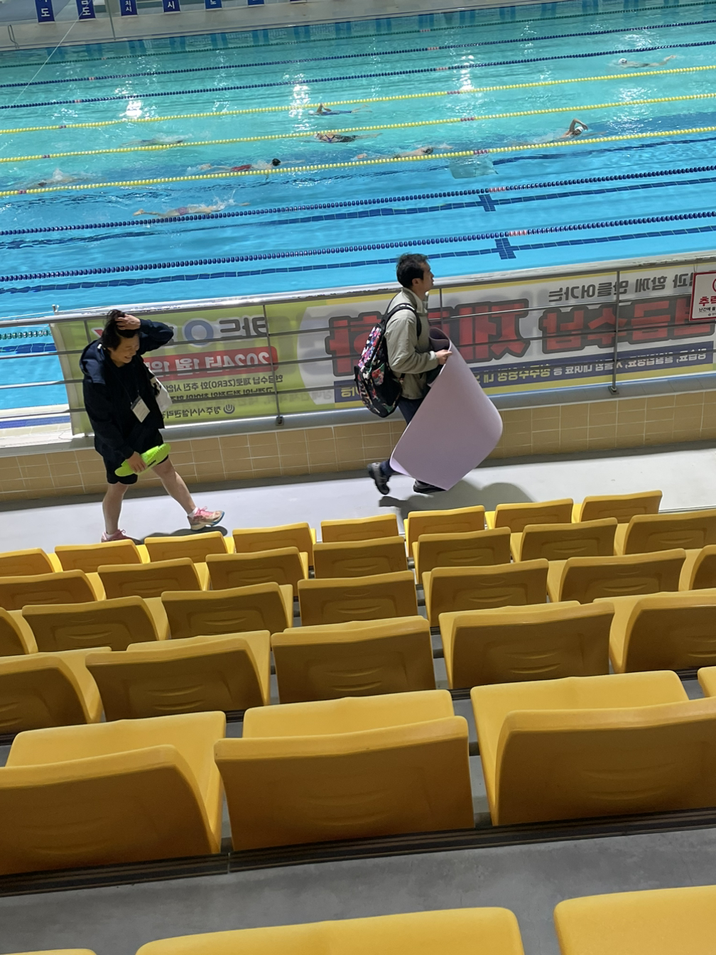 이날 아이 아빠가 못 온 터라 생소한 탈의실, 샤워실에 아이 혼자 들어가서 잘하려나, 바구니는 잘 챙기려나 몹시 걱정이 되었다. 어찌 저찌 서울 연맹 팀 코치님 도움으로 탈의실까지는 들어갔고, 웜업 마치고 아이가 나오기만을 기다리고 있었다. 10분, 20분... 얘가 설렁설렁 샤워를 하는 아이라 20분이면 충분히 머리까지 다 말리고 나오는데 왜 안 나오지, 다른 남자 어른한테 부탁을 해야 하나 이러면서 두리번거리고 있는데...