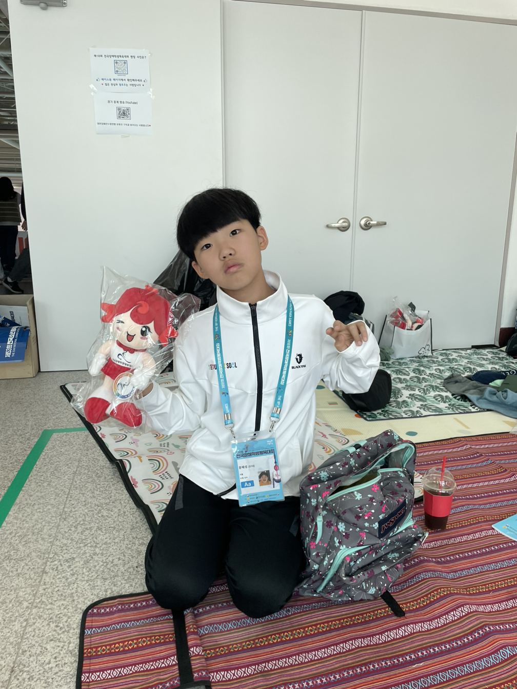 오늘은 마지막 날, 아침 10시 웜업 마치고 10시 30분 첫 경기 시작하기 전까지 레크리에이션 오빠야를 모셔서 한 25분간 진짜 광란의 도가니가 되어 재미나게 춤추고 놀았다. 경품까지 마련하고... 다들 한마음이 되어 싸이의 그대의 연예인이 되어~ 평생을 웃게 해 줄게요~ 떼창 하고, '마지막 승부'를 쬬! 쬬! 소리 지르며 노래 부르는데 전광판에는 10분 뒤 아들 경기한다고 이름 뜨고.... 마지막 날 첫 경기가 혜성이의 경기였다.