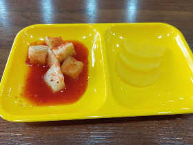 이것이 기본 찬이다. 평범하다. 만두 자체가 맵다보니 저 단무지에 깍두기를 상대적으로 많이 먹게 되었다.