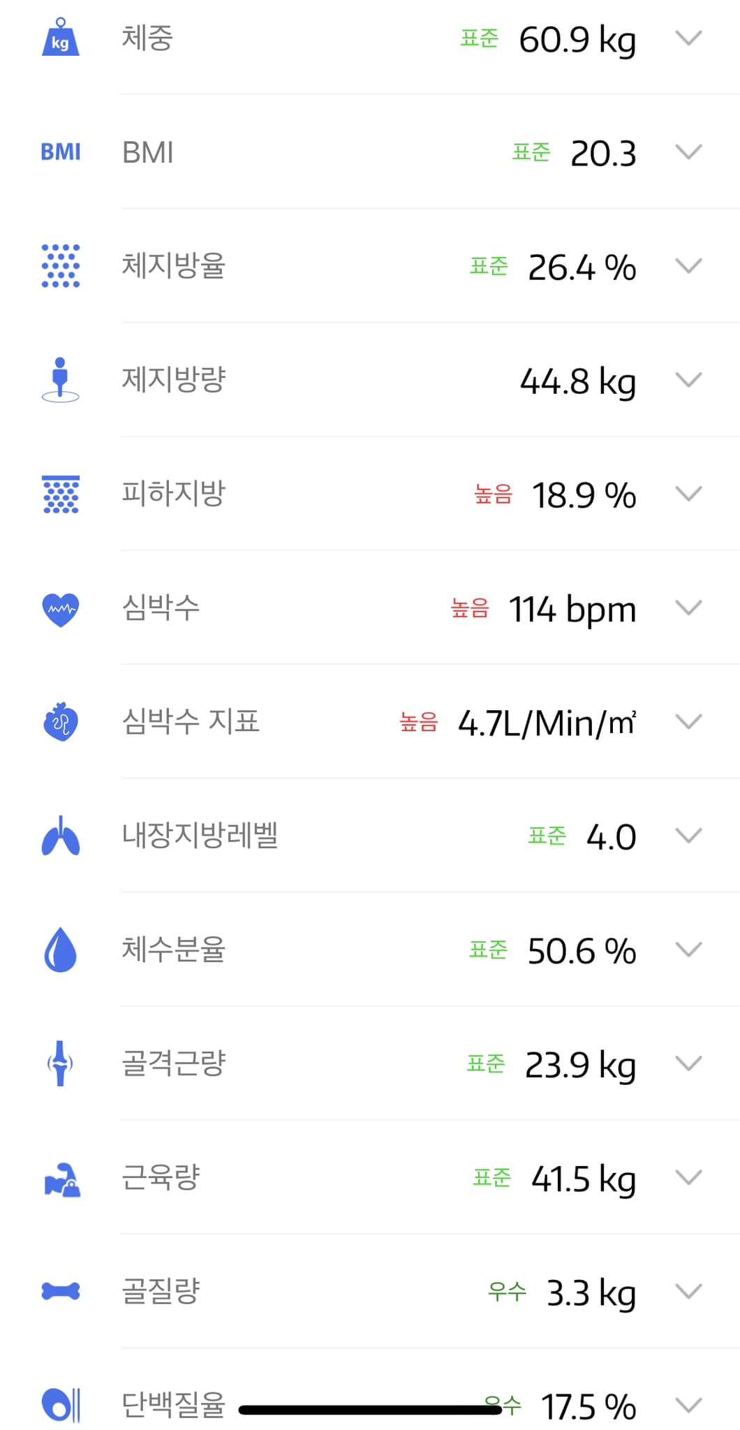 체지방률이 26.0 프로로 처음 시작했을 때보다 0.4프로가 빠진 것에 위안을 삼으며…
