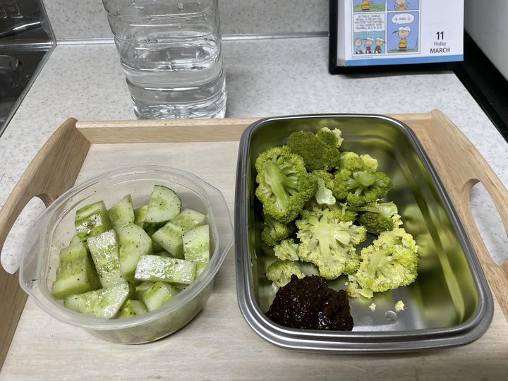 단백질 셰이크가 내 입맛에는 너무 달고, 포도맛이 나는 유산균 가루 한 포까지 함께 넣으니 맛이 조금 힘든 것 외에는 좋다. 그리고, 삶은 채소와 두부를 먹는 것은 무난하다. 간장을 조금 뿌려 먹거나 올리브 오일에 소금, 후추를 뿌려 먹는다.
