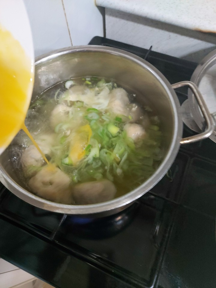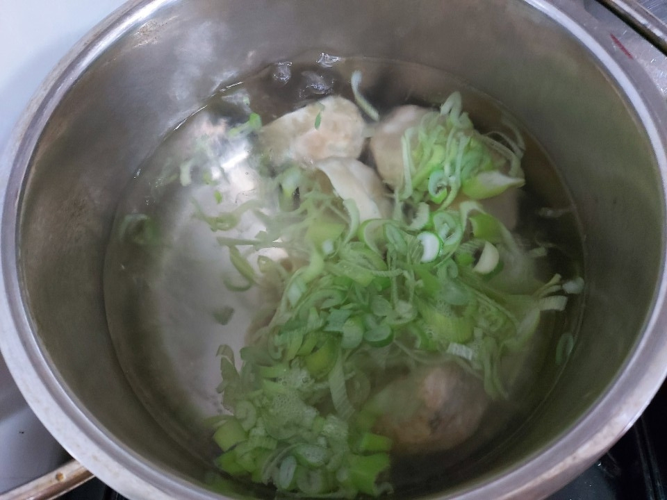 도대체 맹물로 어떤 맛을 낸다는 것일까. 궁금해서 나도 냄비에 물을 올리고, 파를 잘게 썰어서 듬뿍 넣어 보았다. 이것이 아주 맛있는 계란국의 비법이기도 한데, 쉬운 음식 같으면서도 계란을 아주 포슬포슬 하게 얹어내는 것이 기술이다. 그냥 휘젓지 않는다고 해서 저 할머니 만두국 같은 비주얼이 되는 것은 아니다.