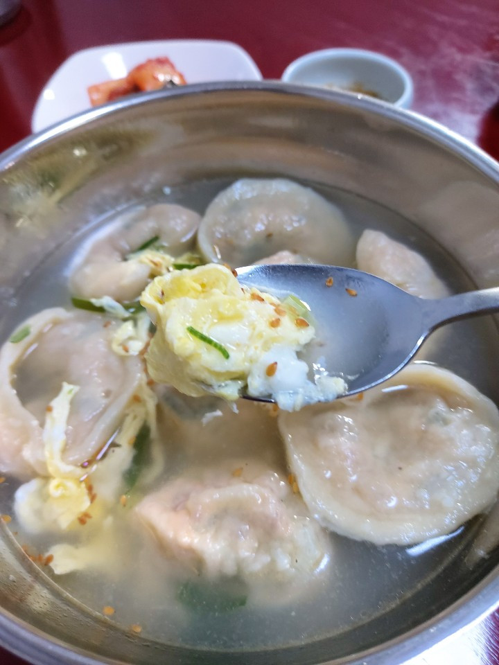아니 국물을 잡고 뭐하고 할 것이 없이 이집 국물은 맹물 베이스다. 멸치나 다시마 등의 육수를 내지 않고, 그냥 생 맹물에다가 먼저 파를 잔뜩 집어넣어서 팔팔 끓인다. 사실 그게 무슨 맛이 있겠나 싶었지만 만두와 어우러지면 최고의 조화를 이룬다. 그리고, 저 야들야들한 계란이 킬링 포인트. 국물, 만두, 계란이 정말 땀 뻘뻘 내며 쉴새 없이 먹게 만든다.