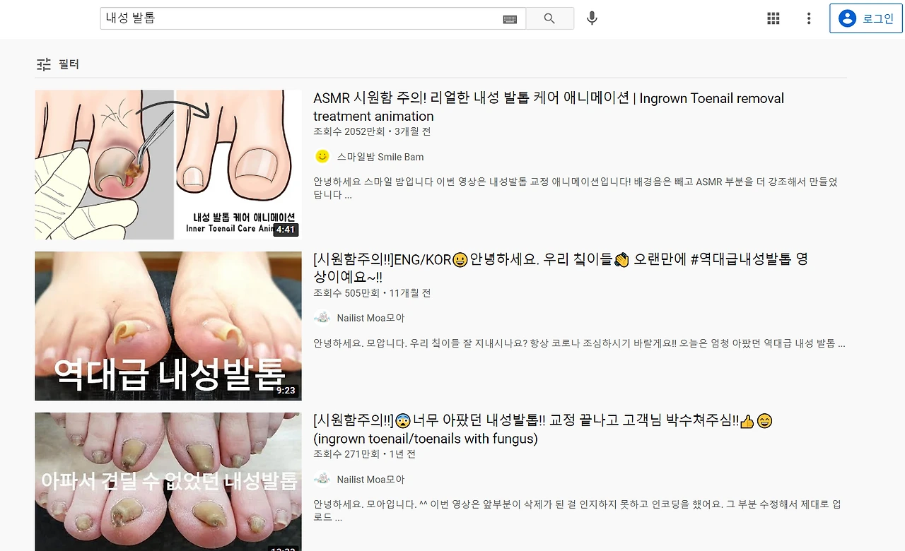 잠깐 고민했는데 크게 문제 되는 건.. 없... 아니다. 있었다. 조심스럽게 고백하자면 나는 가끔 내성발톱 영상을 찾아본다.