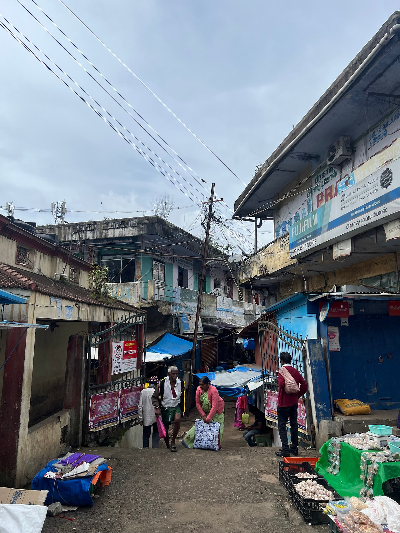 좁은 도로 옆에는 허름하고 낮은 높이의 상점들과 수레바퀴를 끄는 상인들,