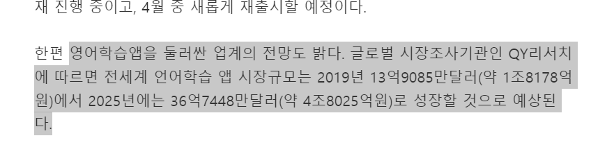 또한 2021년 한국정보화진흥원(KISA)에서 발표한 보고서에 따르면, 2019년 대비 2020년 온라인 영어교육 시장은 46% 증가한 452억원대를 기록했다고 보고하고 있다.