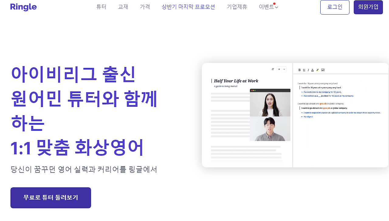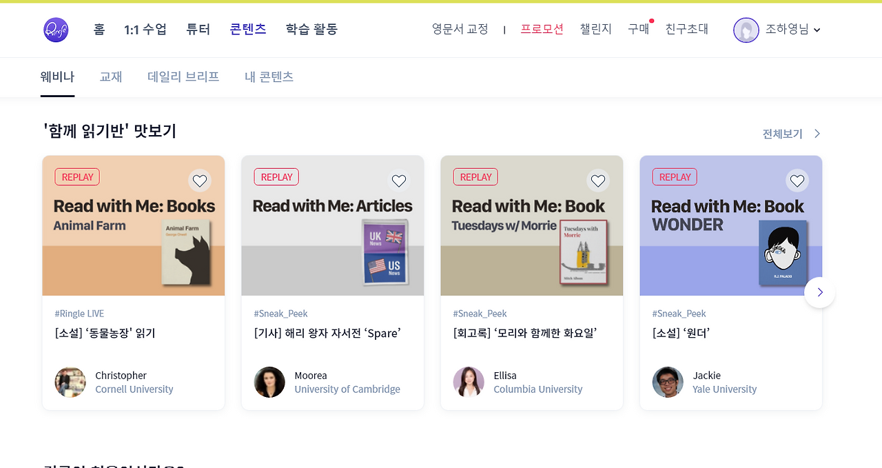 링글 웹사이트를 로그인하면 다양한 콘텐츠를 확인할 수 있다.