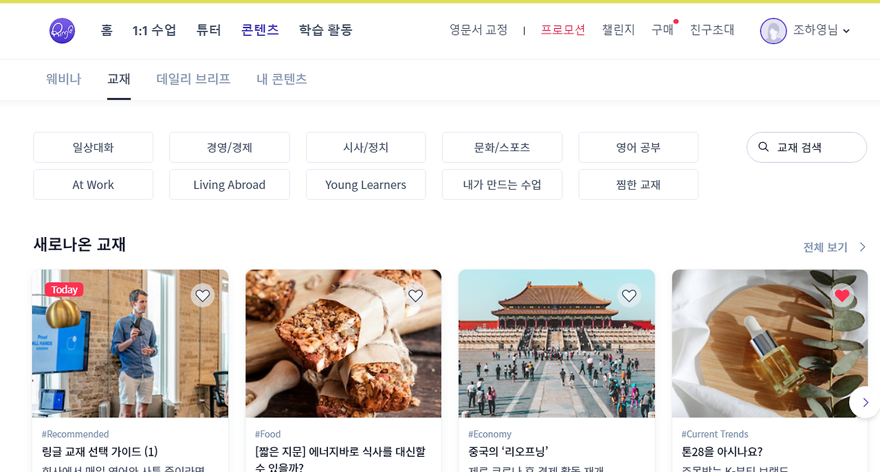 지금 보고있는 화면은 교재 페이지인데 들어가보면 알겠지만 교재의 종류가 굉장히 많고 주제도 다양하다.